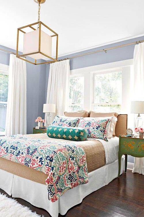 You can use gold metal fixtures for curtain rods, table lamps, and a golden photo frame will also bring charm to the bedroom.