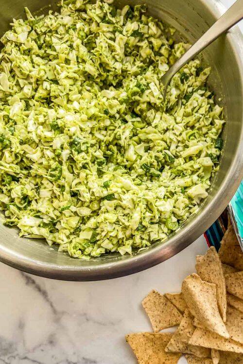 The ingredients include green cabbage, celery, mayonnaise, apple cider vinegar, purple cabbage and black pepper.