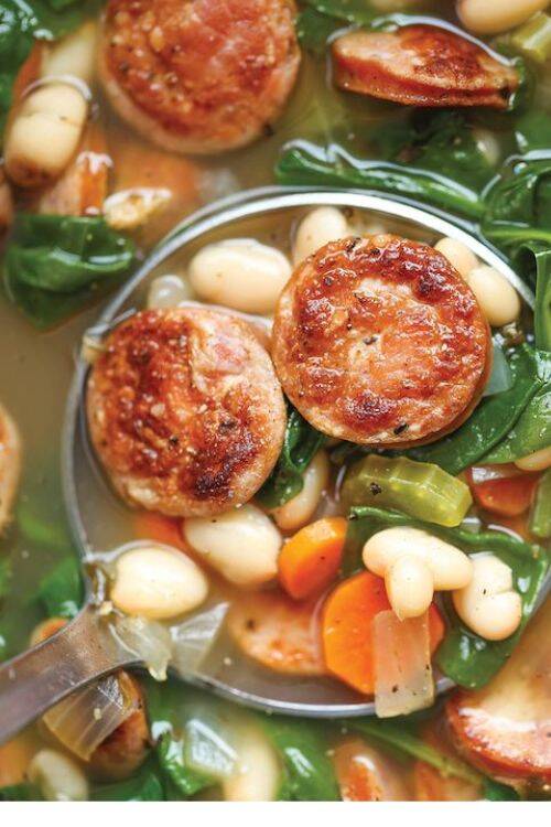 The ingredients include smoked sausage, onion, celery, baby spinach and Great Northern beans.