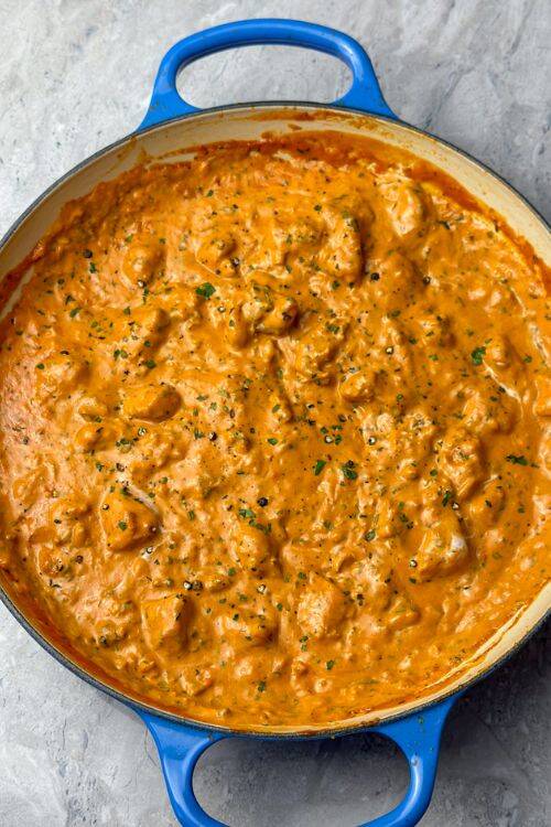 The ingredients include sweet paprika, tomato sauce, chicken thighs, Greek yogurt and curry powder.