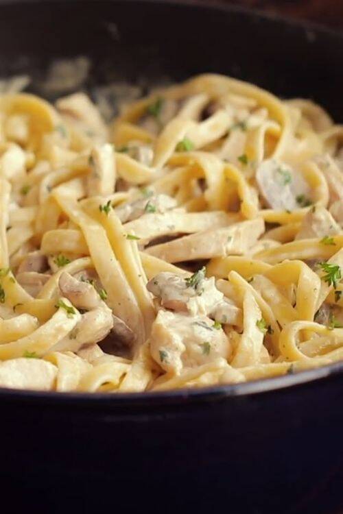 The ingredients include chicken breasts, fettuccine pasta, parsley, butter and white mushrooms.