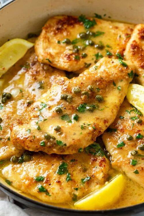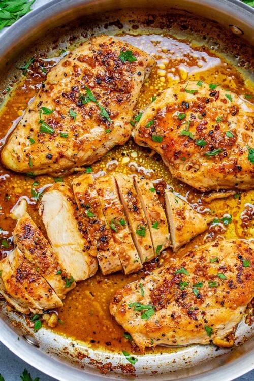 The ingredients include chicken breasts, butter, black pepper, garlic and white wine.