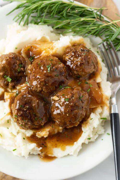 The ingredients include ground beef, yellow onion, butter, breadcrumbs and pepper.