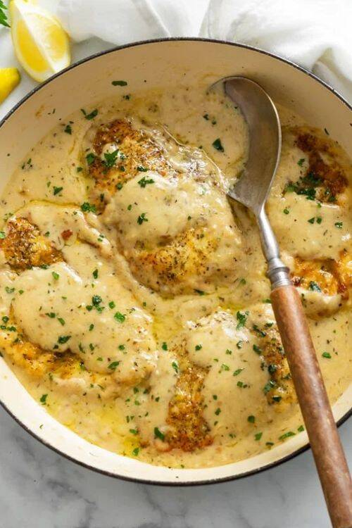 The ingredients include chicken breasts, white wine, Italian seasoning, butter and cornstarch.