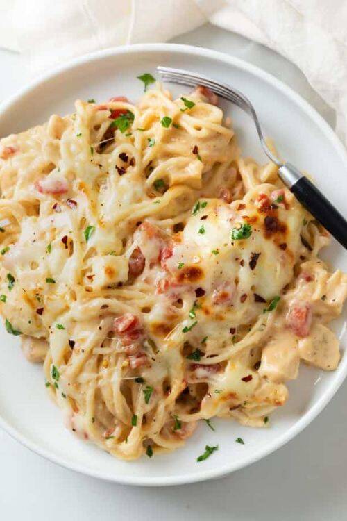 The ingredients include chicken breasts, spaghetti, butter, onion and flour.