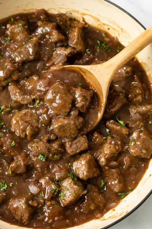The ingredients include sirloin tips, brown sugar, beef bouillon cube, onion and flour.