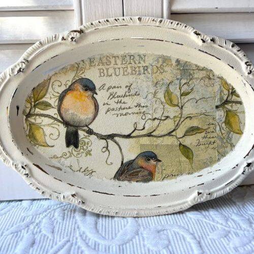 It is one of the best DIY Dollar Store Easter decorations. The supplies needed are Dollar Tree silver tray, sandpaper, a bird napkin, and Mod Podge.