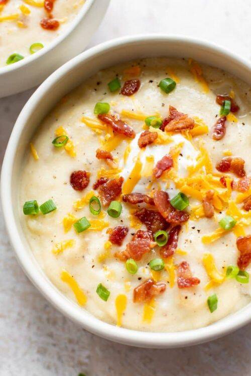 The ingredients include bacon, garlic, chicken broth, potatoes and cheddar cheese.