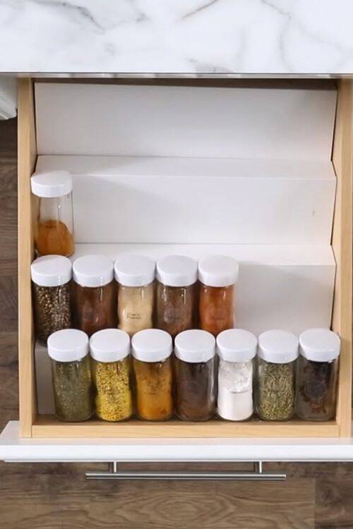 This is one of the best examples of DIY cabinet organization. All the items are kept vertically and it look classy too. A perfect example of an organized kitchen.