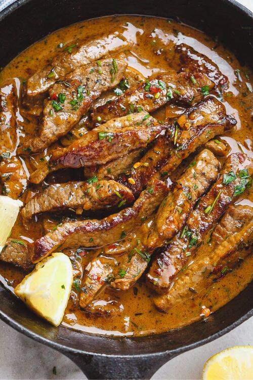 The ingredients include ground black pepper, steak, parsley, butter and onion.