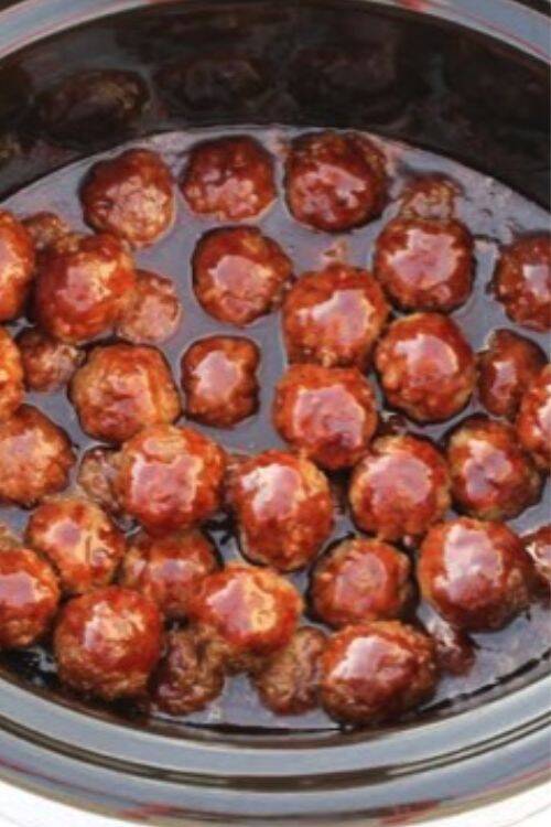 The ingredients include cooked frozen meatballs, BBQ sauce and grape jam.