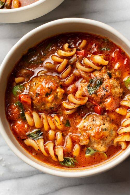 The ingredients include meatballs, fusilli pasta, beef broth, onion and bell pepper.