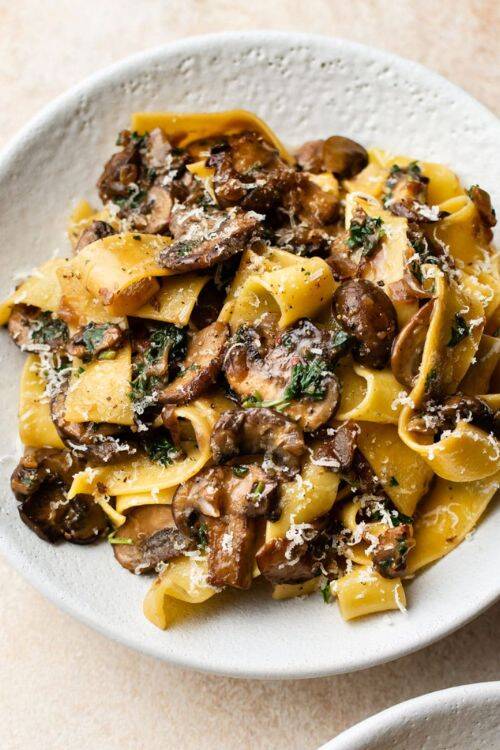The ingredients include cremini mushrooms, garlic, pasta, parsley, spinach, half & half, pepper, salt,and pepper. It is best served with crusty bread and salad.