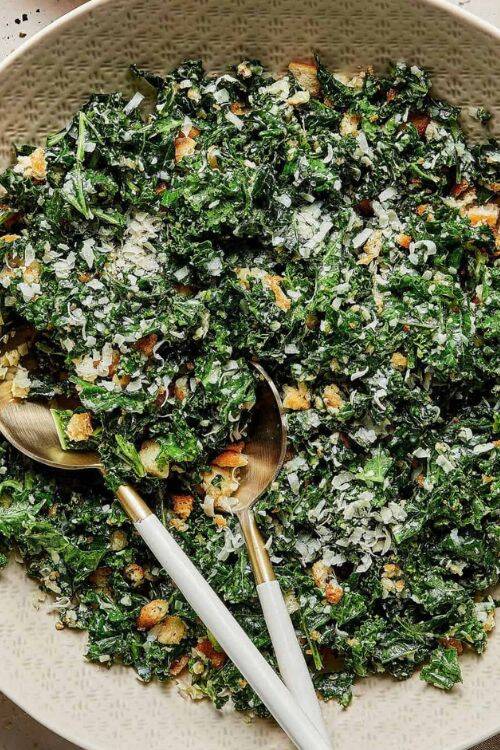 The ingredients include kale, lemon juice, croutons, Parmesan cheese and salt.