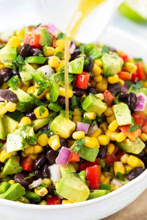 The ingredients include black beans, red wine vinegar, chili powder, lime juice and sweet corn.