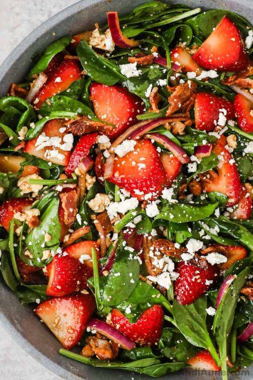 The ingredients include strawberries, baby spinach, feta cheese, bacon and balsamic vinegar.