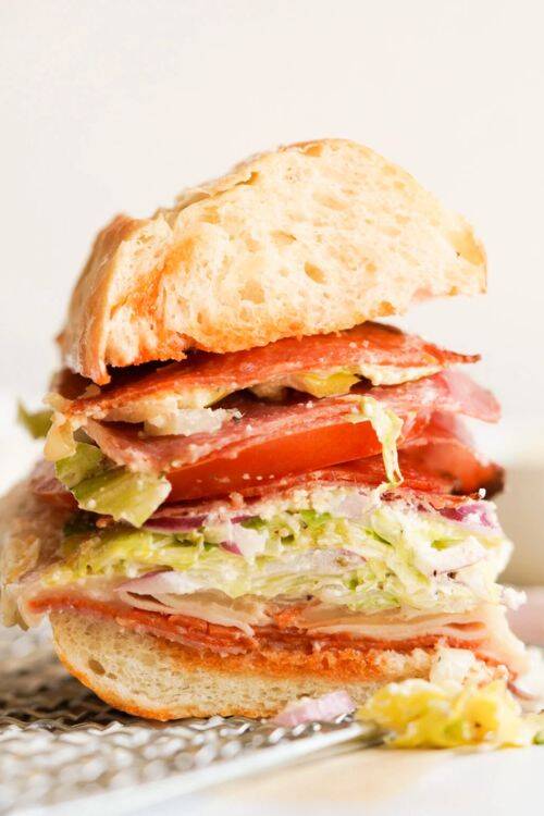 It is also known as a submarine sandwich. It is made using a cylindrical bread roll. These sandwiches are stuffed with meat, condiments, and lots of veggies.