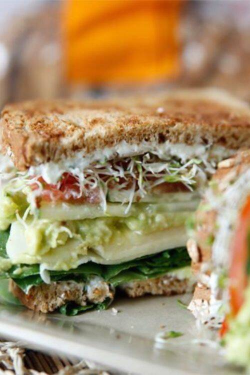 The ingredients include bread, spinach, avocado, Swiss cheese and sprouts.