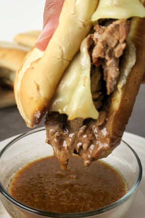 The ingredients include beef steak, French bread rolls, provolone cheese, brown gravy mix and garlic powder.