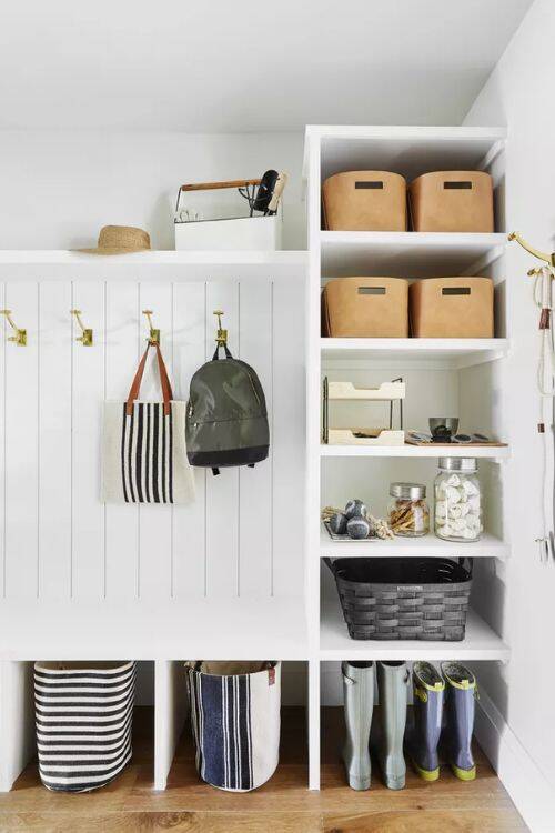 You can find these hooks on Amazon or in other online stores. The entryway is nicely decorated with greenery, and the buckets under the bench are kept for storage purposes.