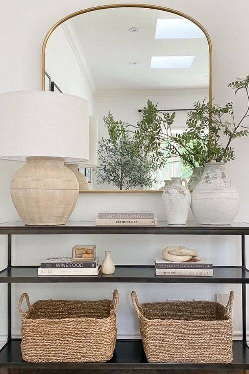 Accessorize the table with books, a basket, a table lamp, and decorative pieces. Hang a mirror becuase you want to see how you look one last time before you go out.