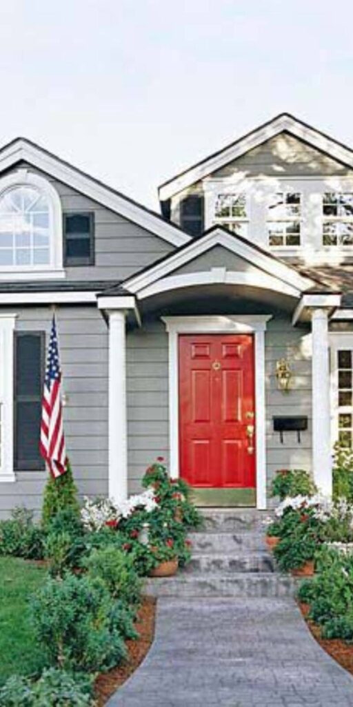 The red door is like a breath of fresh air. It takes the entryway to the next level. I like this gray pathway.