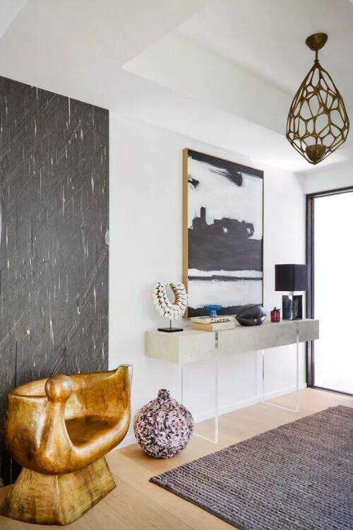 This entryway decor looks classy. It looks modern and arty too. I love the painting. The shelf gives the feeling of a floating shelf becuase of its transparent stand, and that looks stylish.