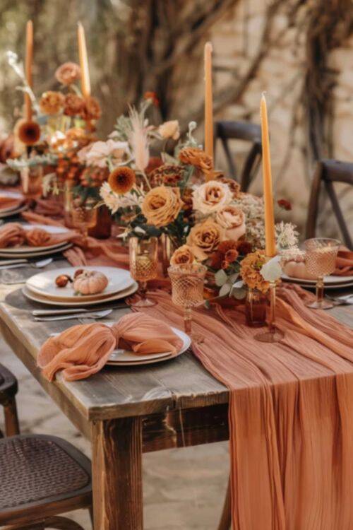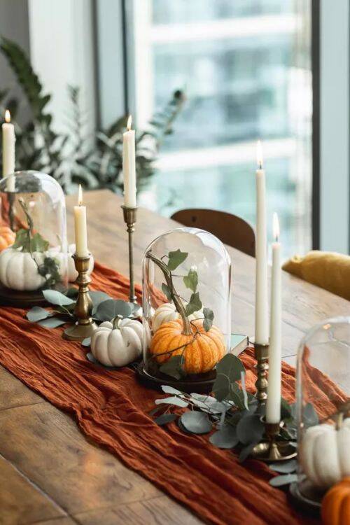 To get the look you need candlesticks, candles, pumpkins, leaves, and napkin rings.