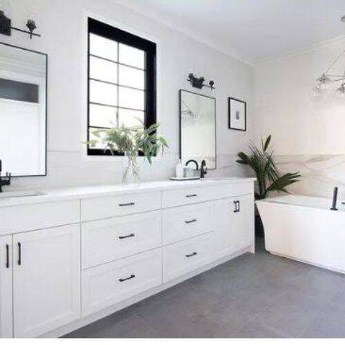 Keep most of the things in white and keep the showers, handles, black pulls, floating shelves, and curtain rod in black.