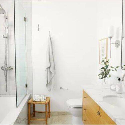 The wooden vanity, stool, and a little greenery add the desired effect. It is one of the best white bathroom designs.