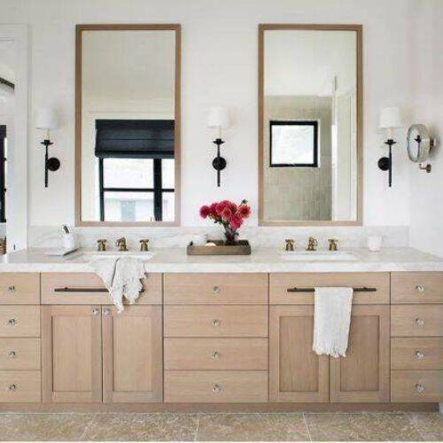 I like the mirror with wooden frames; it matches the bathroom decor. The red flowers bring a dash of color to the bathroom decor. I like the sconce; these look cute and elegant.